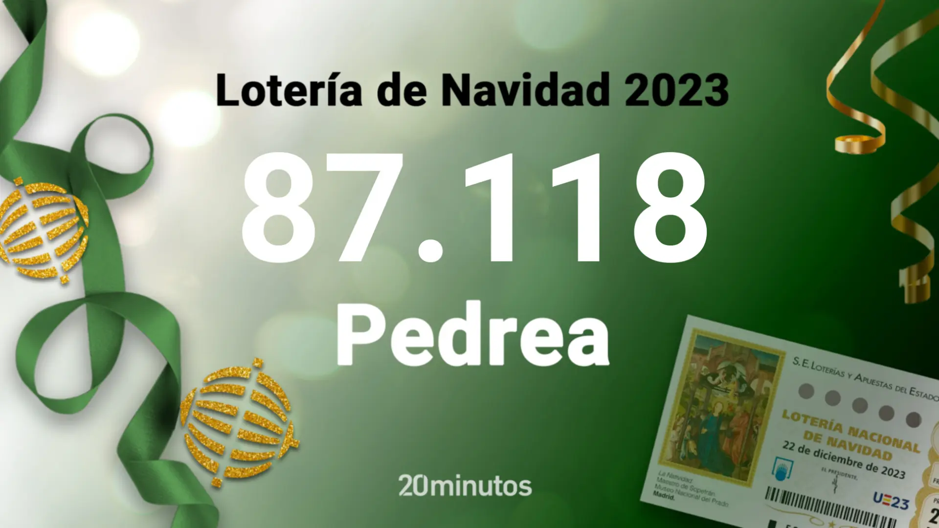 El 87118, número agraciado en la pedrea de la Lotería de Navidad y dotado de 1000 euros